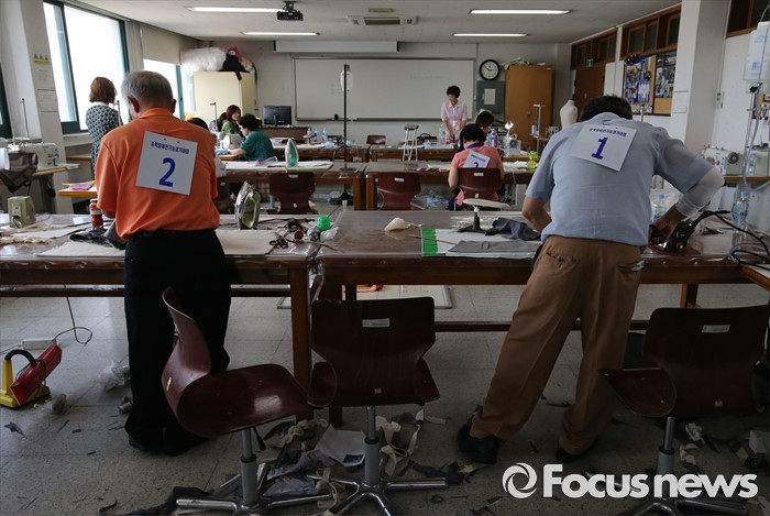 (청주=포커스뉴스) 30일 오후 충북 청주시 서원대학교에서 열린 충북 장애인기능경기대회 양복, 양장, 한복 종목 참가자가 과제를 수행하고 있다.