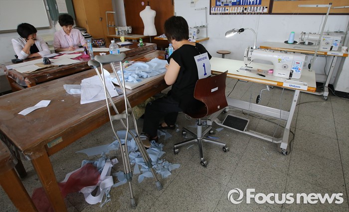 (청주=포커스뉴스) 30일 오후 충북 청주시 서원대학교에서 열린 충북 장애인기능경기대회 양복, 양장, 한복 종목 참가자가 과제를 수행하고 있다.