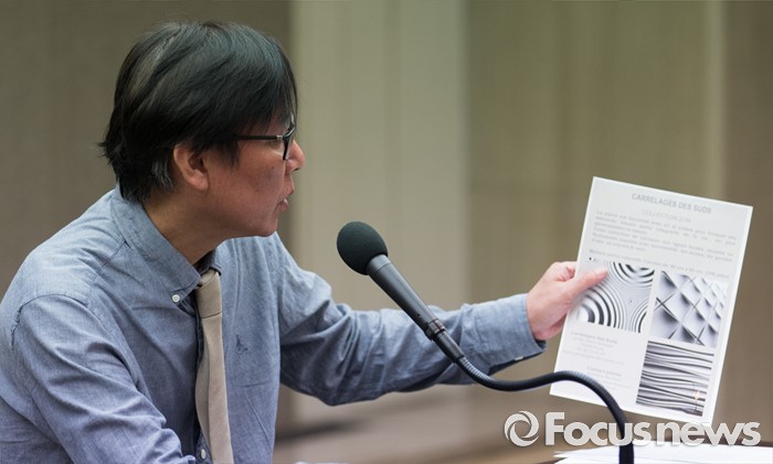 (서울=포커스뉴스) 이동열 투씨엠 대표가 1일 오전 서울 중구 프레스센터에서 열린 제2롯데월드 입면 표절의혹 기자회견에 참석해 발언하고 있다. 이 대표는 자사 디자인 '스타 컬렉션'을 45도 회전하면 제2롯데월드 에비뉴엘관의 디자인과 일치한다고 주장했다.