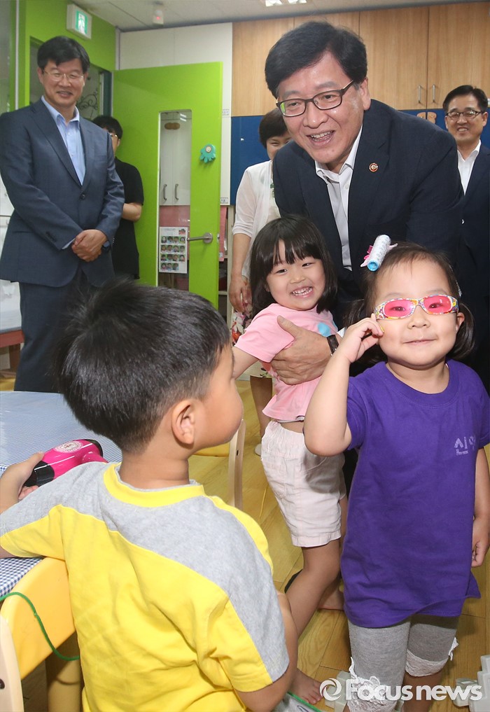 (서울=포커스뉴스) 어린이집을 종일반과 맞춤반으로 나눈 맞춤형 보육 제도가 시행된 1일 서울 성동구 신영창의어린이집을 방문한 정진엽 보건복지부 장관이 원아들과 대화하고 있다.
