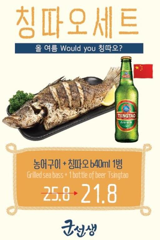 '칭따오 숯불농어구이 세트'는 칭따오 맥주 640ml 1병과 군선생의 여름 제철메뉴인 숯불농어구이로 구성된 신메뉴다.
