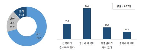 유영호 중기중앙회 산업지원본부장은 "대형조선사에는 막대한 공적자금과 구체적인 구제방안이 강구되고 있지만 우리나라 조선업의 기반이 되는 관련 중소협력기업들에 대해서는 대출자금 회수, 납품대금 미납 등의 경영상황에 대한 지원책이 미비한 실정"이라며 "세계적 기술력을 쌓아 온 우리 조선기자재산업이 대외 환경적 요인으로 붕괴된다면 국가적 손실이므로 대형조선사 협력중소기업에 대한 지원대책 마련과 조기시행이 시급하다"고 밝혔다.3년간 매출액 변화추세.(N=300, 단위·%)<자료제공=중기중앙회>조선업 경기·수주절벽 회복시점 전망(N=300, 단위·%)<자료제공=중기중앙회>
