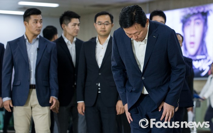 (서울=포커스뉴스) 신동빈 롯데그룹 회장이 3일 오후 서울김포공항을 통해 귀국, 취재진을 향해 허리 숙여 사과하고 있다. 신 회장은 이날 기자들에게 최근 롯데그룹을 둘러싼 일련의 사태에 대해 "죄송하다"고 공식 사과 했다.