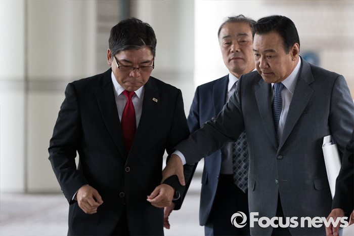 (서울=포커스뉴스) 정치자금법 위반 혐의를 받고 있는 '성완종 리스트'의 이완구(오른쪽) 전 국무총리가 항소심 4회 공판에 참석하기 위해 4일 오전 서울 서초구 서울고등법원으로 들어서고 있다.