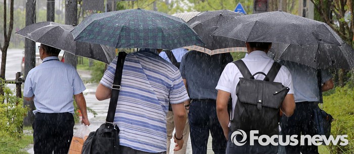 (세종=포커스뉴스) 충청 및 중부지역에 호우경보가 내려진 4일 세종시 정부세종청사에서 직원들이 우산을 쓰고 지나고 있다.