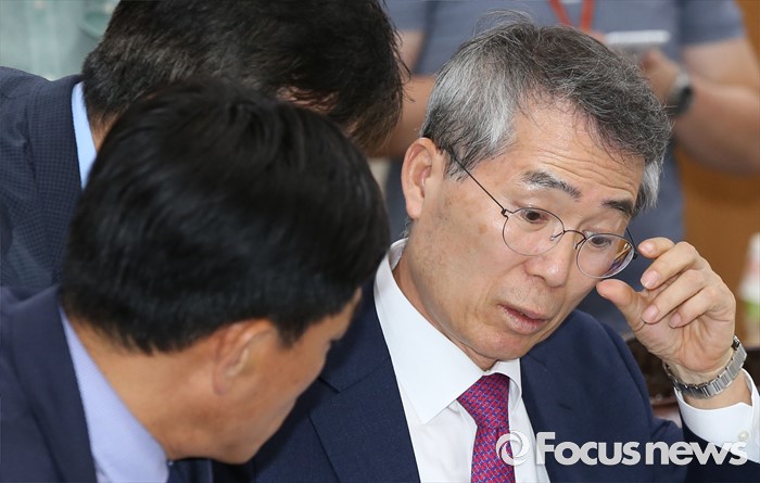 (세종=포커스뉴스) 4일 오후 세종시 정부세종청사 고용노동부 최저임금위원회 전원회의실에서 열린 제8차 전원회의에서 박준성 위원장이 류경희 부위원장과 대화하고 있다.
