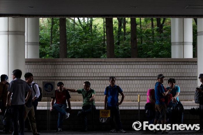 (서울=포커스뉴스) 4일 오후 서울중앙지법 앞에서 민주노총 조합원 및 관계자들이 한상균 위원장의 1심 선고 공판 방청 후 기자회견을 갖기 위해 기다리고 있다. 지난해 11월 열린 민중총궐기 대회 불법 시위 주도 혐의로 기소된 한 위원장은 이날 열린 1심 재판에서 징역 5년을 선고받았다.