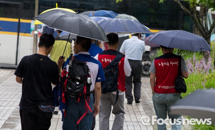 (서울=포커스뉴스) 4일 오후 서울중앙지법 앞에서 한상균 민주노총 위원장의 1심 선고 공판 후 열린 기자회견에 을 마친 조합원 및 관계자들이 법원 밖으로 발걸음을 향하고 있다. 지난해 11월 열린 민중총궐기 대회 불법 시위 주도 혐의로 기소된 한 위원장은 이날 열린 1심 재판에서 징역 5년을 선고받았다.
