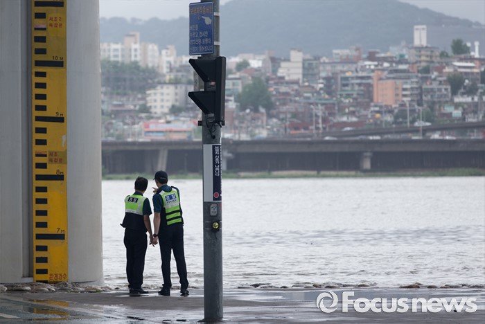 (서울=포커스뉴스) 장마전선이 북상하면서 전국 곳곳에 호우특보가 발표 중인 5일 오전 서울 서초구 잠수교가 통제되고 있다.