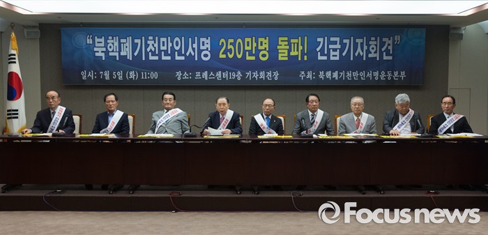 (서울=포커스뉴스)5일 오전 서울 중구 프레스센터에서 열린 북핵폐기 천만인서명, 250만명 돌파 기자회견에 참석한 이종윤(왼쪽 네번째) 목사가 인사말 하고 있다.