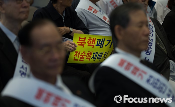 (서울=포커스뉴스) 북핵폐기천만인서명운동본부 등 시민단체 관계자들이 5일 오전 서울 중구 프레스센터에서 열린 북핵폐기 천만인서명, 250만명 돌파 기자회견에 참석해 손피켓을 들고 있다.