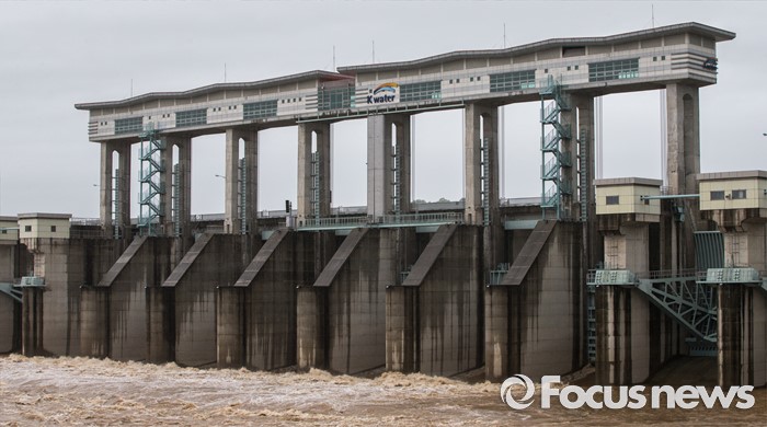 (연천=포커스뉴스) 태풍 네파탁이 북상하고 전국 곳곳에 호우주의보와 경보가 내린 5일 오전 경기도 연천군 군남홍수조절지에서 한국수자원공사가 수위조절을 위해 임진강 강물을 방류하고 있다.
