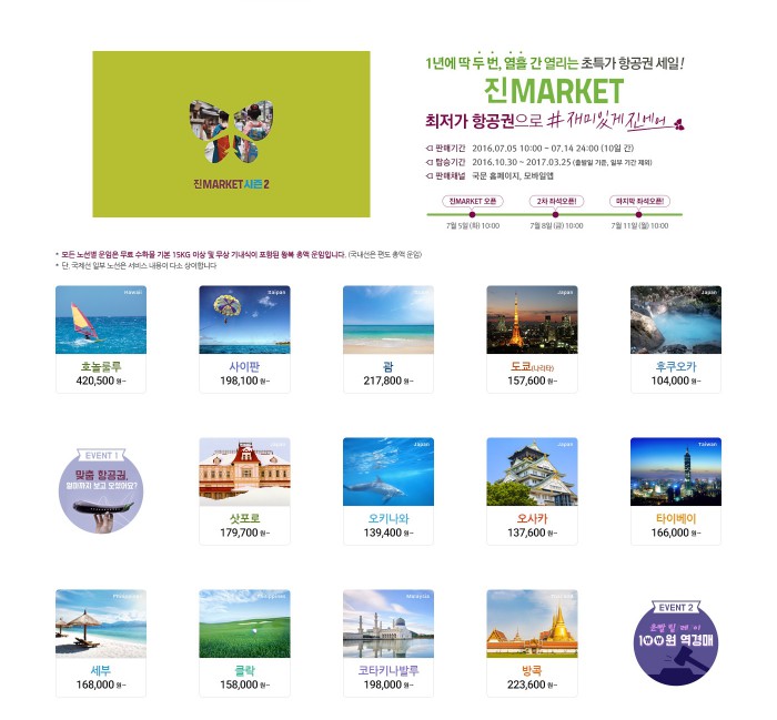 (서울=포커스뉴스) 저비용항공사 진에어가 연중 최대 특가 행사인 '2016년 하반기 진마켓'을 오는 14일까지 진행한다고 5일 밝혔다.