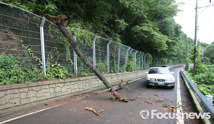 (옥천=포커스뉴스) 며칠간 이어진 중부지역 집중호우로 6일 오후 충북 옥천군 군복면 도로에 나무가 쓰려져 있다.