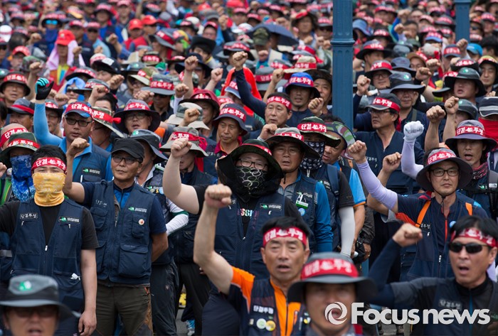 (서울=포커스뉴스) 전국건설노동조합 조합원들이 6일 오후 서울역광장에서 총파업 집회에 앞서 건설사 직접 시공제 도입 등 18대 대정부 요구안 제시를 촉구하는 구호를 외치고 있다.