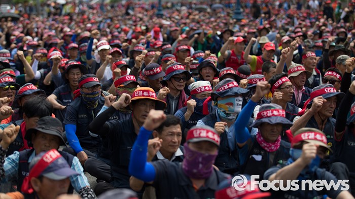 (서울=포커스뉴스) 전국건설노동조합 조합원들이 6일 오후 서울역광장에서 총파업 집회에 앞서 건설사 직접 시공제 도입 등 18대 대정부 요구안 제시를 촉구하는 구호를 외치고 있다.