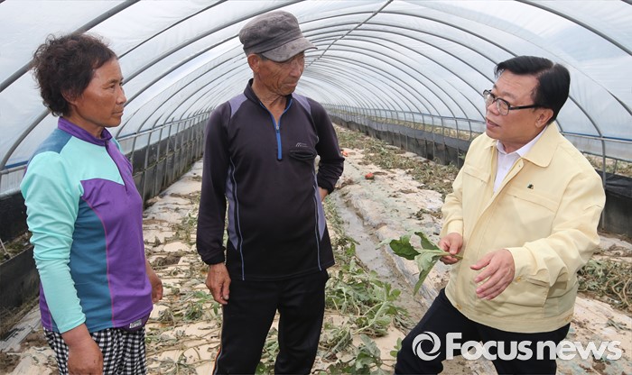 (부여=포커스뉴스) 이동필 농림축산식품부 장관이 6일 오후 집중호우로 수해를 입은 충남 부여 정동리 수박 비닐하우스를 찾아 수해를 입은 농작물을 살펴본 뒤 농민들의 애로사항을 듣고 있다.