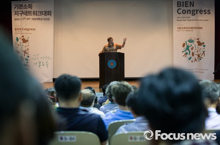 (서울=포커스뉴스) 가이 스탠딩 영국 런던대학교 동양아프리카연구대학(SOAS) 교수가 7일 오전 서울 서강대학교 다산관에서 열린 제 16차 기본소득지구네트워크 대회에서 발언하고 있다. 이번 16차 대회는 아시아에서는 처음 열리는 기본소득 국제 대회로 세계 23개국에서 기본소득 운동을 벌이는 활동가와 이론가들이 참석한다.