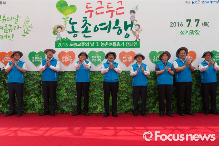 (서울=포커스뉴스) 7일 오후 서울 종로구 청계천 광장에서 이동필(왼쪽 네 번째) 농림축산식품부 장관 및 내빈들이 '2016 도시 농촌 교류의 날 및 농촌여름휴가 캠페인'에 참석하고 있다.