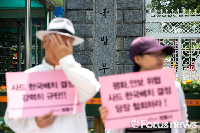 (서울=포커스뉴스) 국방부가 사드의 한국 배치를 결정한 8일 오후 서울 용산구 국방부 앞에서 사드 한국 배치를 규탄하는 평화와 통일을 여는 사람들 관계자들의 시위가 열리고 있다.
