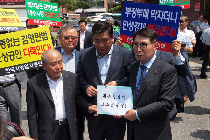 이어 "법의 취지가 훼손되고 변질된 것을 알면서도 무조건적으로 받아들이라고 하는 것은 선량한 소상공인들이 힘없는 것을 악용, 무시하는 처사"라며 김영란법 개정을 요구했다.