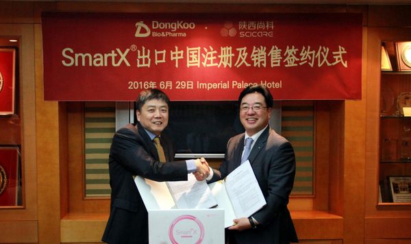 동구바이오제약 조용준 사장은 “스마트엑스의 해외 진출을 위해 중국, 일본 특허를 비롯 미국 FDA, 유럽 CE인증을 받는 등 많은 노력을 해왔다”며 “이번 수출을 계기로 SCICARE와의 협력 분야를 의약품, 코스메슈티컬 등으로 넓혀나갈 계획”이라고 말했다.동구바이오제약 조용준 사장(오른쪽)과 SCICARE 리우 샤오하오 사장. <사진출처=동구바이오제약>