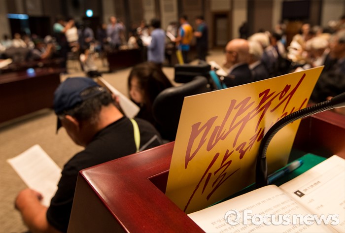 (서울=포커스뉴스) 13일 오전 서울 중구 프레스센터에서 열린 '한상균을 석방하라, 민주주의 살려내자' 7.13 시국회의에 참석한 시국선언인단이 시국선언문을 읽고 있다.