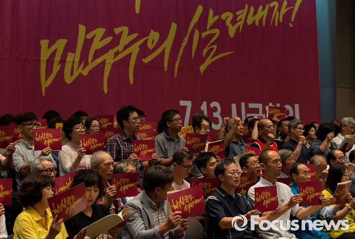 (서울=포커스뉴스) 13일 오전 서울 중구 프레스센터에서 열린 '한상균을 석방하라, 민주주의 살려내자' 7.13 시국회의에 참석한 시국선언인단이 시국선언문 낭독 후 구호를 외치고 있다.