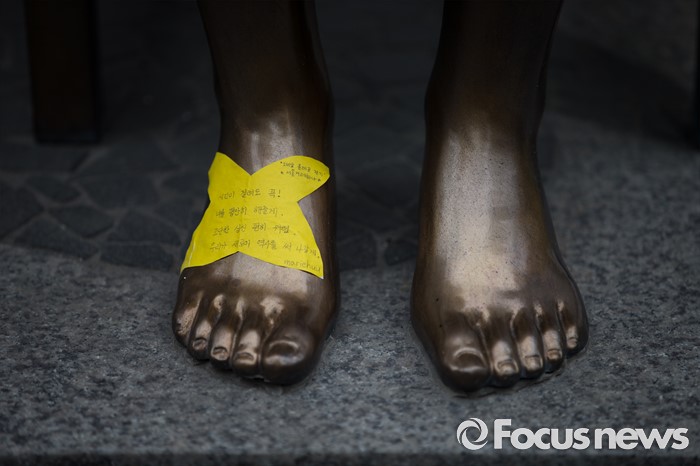 (서울=포커스뉴스) 자위대 창설 62주년 기념행사가 서울 한복판에서 열리고 하루가 지난 13일 오후, 서울 종로구 주한일본대사관 앞에서 일본군 '위안부' 문제 해결을 위한 제1239차 정기 수요집회가 열리고 있다. 소녀상 발등에 누군가가 써 놓은 작은 메모가 남겨져 있다.
