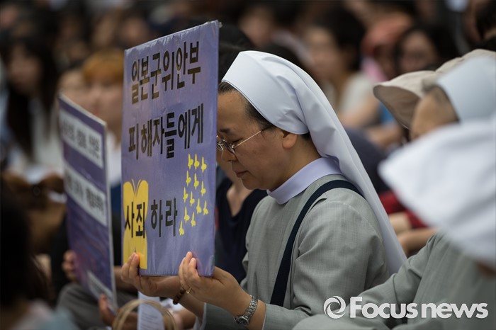 (서울=포커스뉴스) 자위대 창설 62주년 기념행사가 서울 한복판에서 열리고 하루가 지난 13일 오후, 서울 종로구 주한일본대사관 앞에서 일본군 '위안부' 문제 해결을 위한 제1239차 정기 수요집회가 열리고 있다.