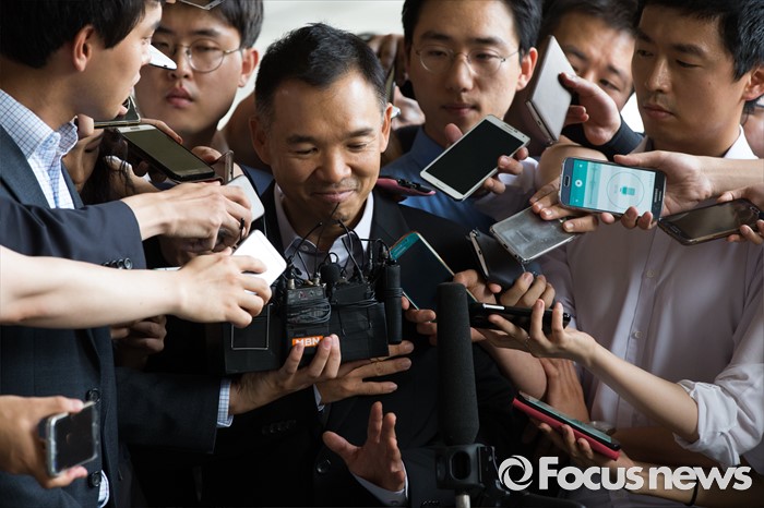 (서울=포커스뉴스) 진경준 검사장의 '주식대박' 의혹과 관련해 넥슨 창업주 김정주 NXC(넥슨지주회사) 회장이 13일 오후 서울 서초구 서울중앙지방검찰청으로 들어서기 전 취재진의 질문을 받고 있다.