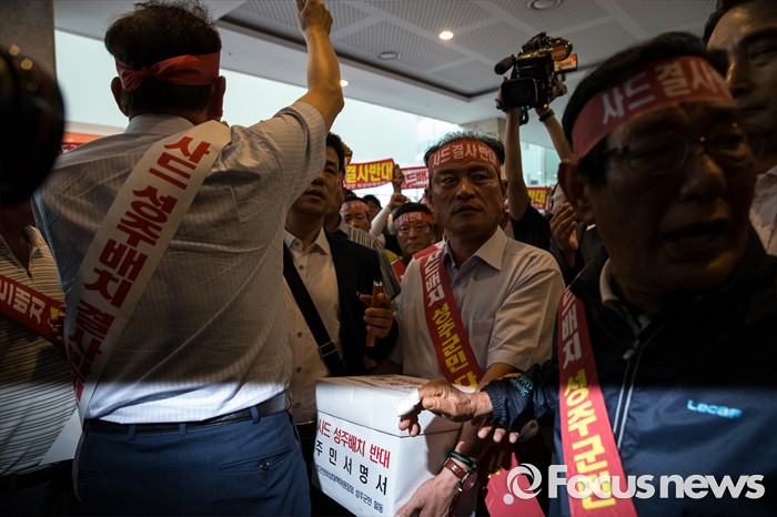 (서울=포커스뉴스) 국방부가 사드 배치 지역을 경북 성주로 확정지은 13일 오후 서울 용산구 국방컨벤션을 찾은 김항곤 군수와 군민들이 반대성명서를 들고 안으로 들어서고 있다.