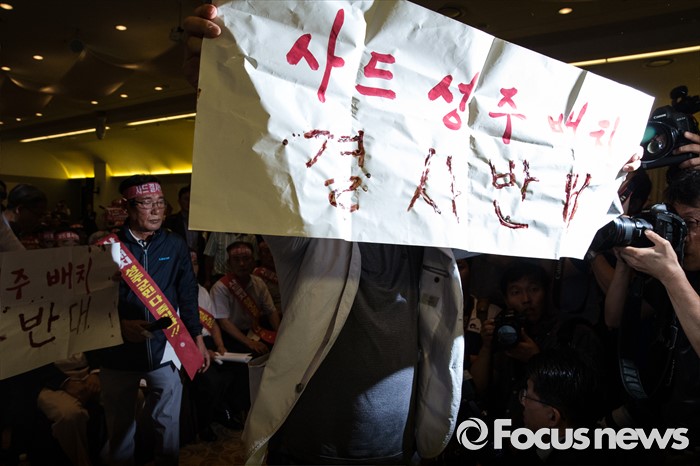 (서울=포커스뉴스) 국방부가 사드 배치 지역을 경북 성주로 확정지은 13일 오후 서울 용산구 국방컨벤션을 찾은 성주군민들이 반대의사를 표하는 혈서를 들고 있다.