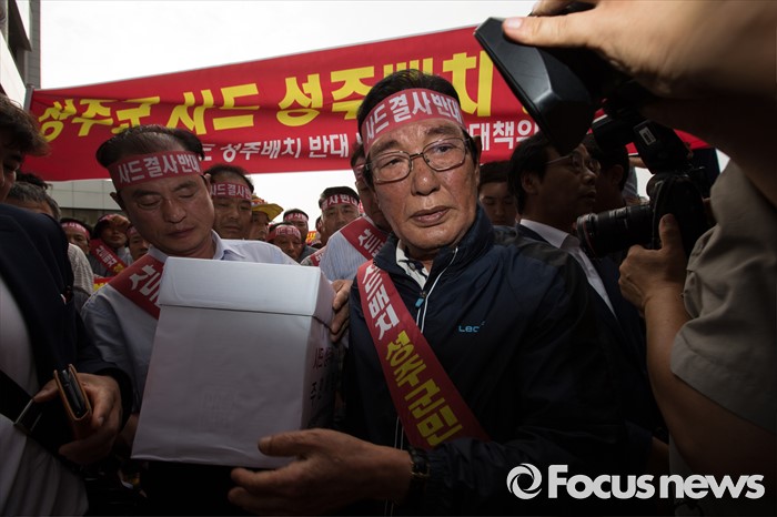 (서울=포커스뉴스) 13일 오후 서울 용산구 국방부를 찾은 성주 군수와 군민들이 사드배치 반대 성명서를 전달하기 위해 국방컨벤션을 들어서고 있다. 이날 국방부에서 주한미군 고고도 미사일 방어 체계 사드(THAAD) 배치 지역을 성주로 결정하고 공식 발표했다.