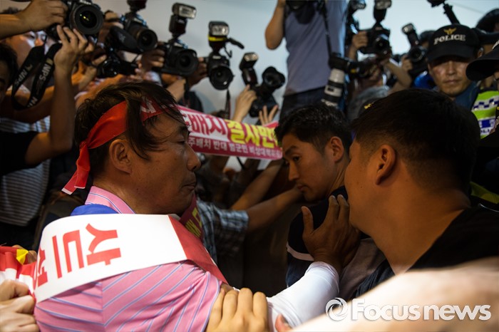 (서울=포커스뉴스) 국방부가 사드 배치 지역을 경북 성주로 확정 지은 13일 오후 서울 용산구 국방컨벤션에서 성주군민들이 군수와 국방부 관계자 면담자리에 진입을 시도하고 있다.
