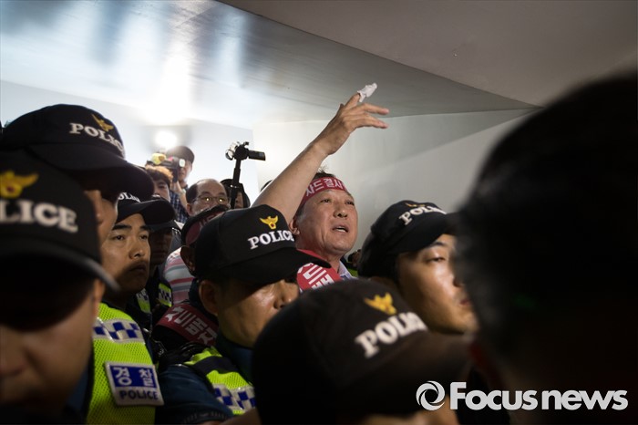 (서울=포커스뉴스) 국방부가 사드 배치 지역을 경북 성주로 확정 지은 13일 오후 서울 용산구 국방컨벤션에서 성주군민들이 군수와 국방부 관계자 면담자리에 진입을 시도하자 김항곤 성주 군수가 군민들을 진정시키고 있다.