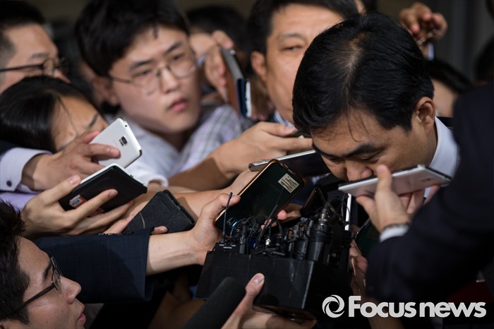(서울=포커스뉴스) '주식 대박' 논란에 휩싸인 진경준 전 검사장이 14일 오전 서울 서초구 서울중앙지방검찰청으로 출석하기 전 고개숙여 사과하고 있다.