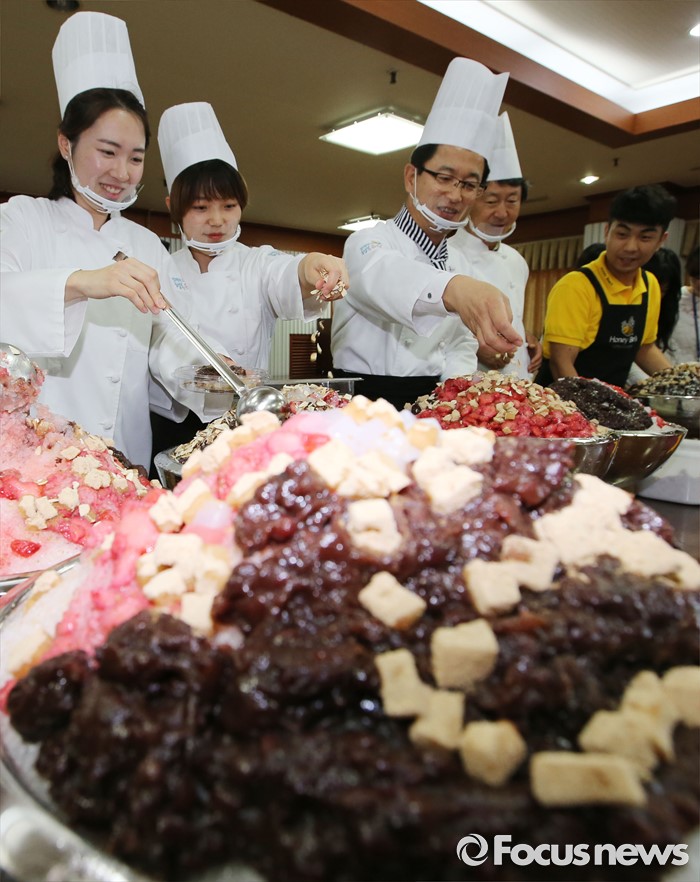 (대전=포커스뉴스) 초복을 사흘 앞둔 14일 오후 대전 유성구청에서 열린 팥빙수데이 행사에서 허태정 구청장과 직원들이 함께 팥빙수를 만들고 있다. 이번 팥빙수데이 행사에는 팥빙수 900인분을 만들어 구 산하 직원들에게 전달했다.