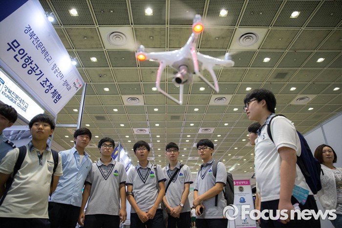 (서울=포커스뉴스) 14일 오후 서울 강남구 코엑스에서 열린 전문대학 엑스포에 참가한 학생들이 무인항공기 조정을 체험하고 있다.