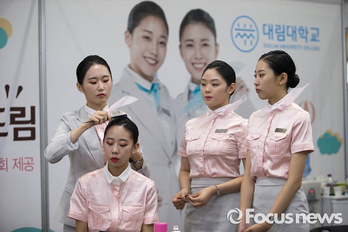 (서울=포커스뉴스) 14일 오후 서울 강남구 코엑스에서 열린 전문대학 엑스포에서 항공운항과 학생들이 실습을 하고 있다.