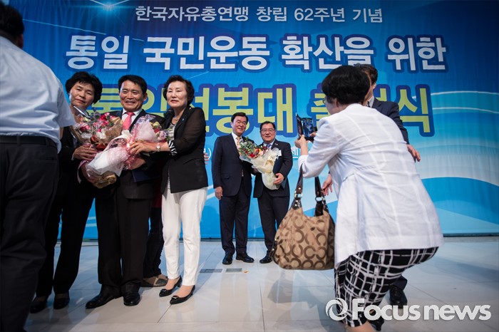(서울=포커스뉴스) 김경재(왼쪽 다섯번째) 한국자유총연맹 회장이14일 오후 서울 중구 한국자유총연맹 본부에서 열린 '한국자유총연맹 창립 62주년 기념 통일 선봉대 출범식'에서 연맹 회원들과 기념사진을 찍고 있다. 이날 출범식을 마친 김경재 한국자유총연맹 회장(전 박근혜 대통령 홍보특별보좌관)과 연맹 회원들은 사드 배치를 지지하는 결의 행동을 했다.