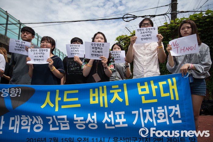 (서울=포커스뉴스) 좋은 대한민국 만들기 대학생 운동본부' 소속 학생들이 15일 오전 서울 용산 미군 기지 앞에서 '사드 배치 반대 48시간 대학생 긴급농성 선포' 기자회견을 열고 있다. 이날 대학생들은 기자회견을 마친 후 용산 미군 기지 2번 게이트 앞에서 48시간 농성에 들어갔다.