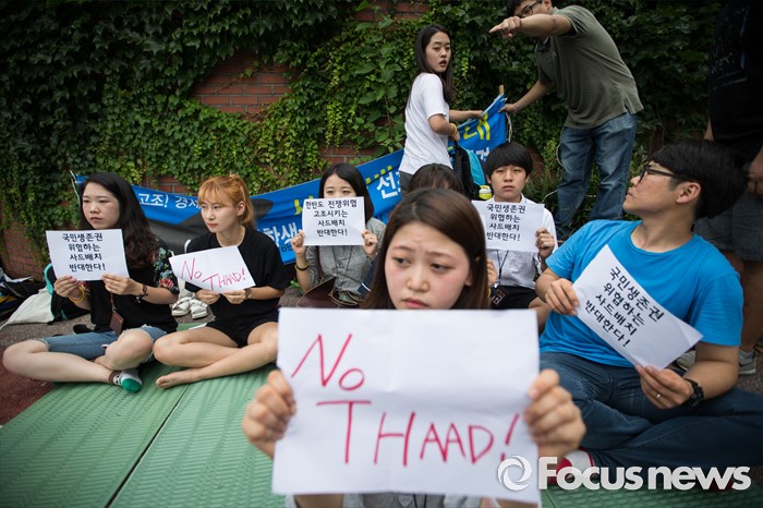 (서울=포커스뉴스) 좋은 대한민국 만들기 대학생 운동본부' 소속 학생들이 15일 오전 서울 용산 미군 기지 앞에서 '사드 배치 반대 48시간 대학생 긴급농성 선포' 기자회견을 마친 후 농성에 들어가고 있다.