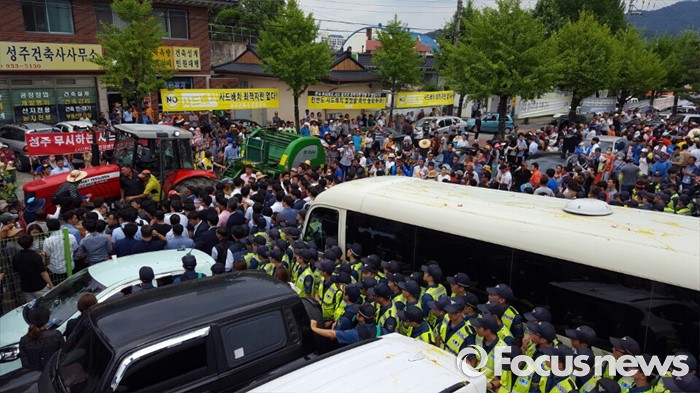 (성주=포커스뉴스) 황교안 국무총리와 한민구 국방부장관이 15일 오전 경북 성주군청광장에서 사드(THAAD, 고고도미사일방어체계) 배치에 대한 주민설명회를 마치고 차량에 오르자 주민들이 트렉터를 동원해 항의하고 있다.