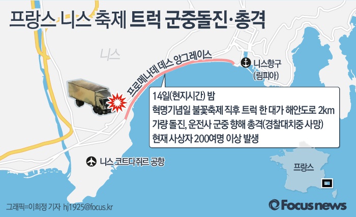 프랑스 니스에서 열린 혁명기념일 축제가 테러로 얼룩졌습니다. 군중들을 향해 돌진한 트럭에 80명 넘게 사망했다고 하는데요. 이번 테러가 IS의 소행인지 수사 중인 가운데, IS 추종자들은 "IS 최고사령관인 오마르 알 시샤니의 죽음에 대한 보복 조치'라고 칭했습니다.