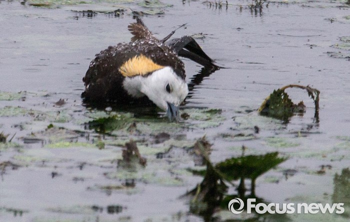 (의왕=포커스뉴스) 장마비 속에서 물꿩이 경기 의왕시 왕송지의 연밭 사이를 헤치며 먹이를 찾고 있다.