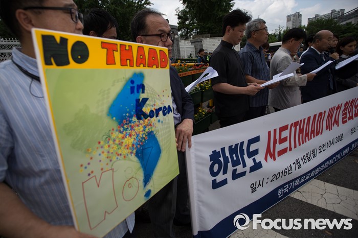 (서울=포커스뉴스) 한국 기독교교회협의회 관계자들이 18일 오전 서울 용산구 국방부 앞에서 사드 배치 반대 기자회견을 하고 있다.