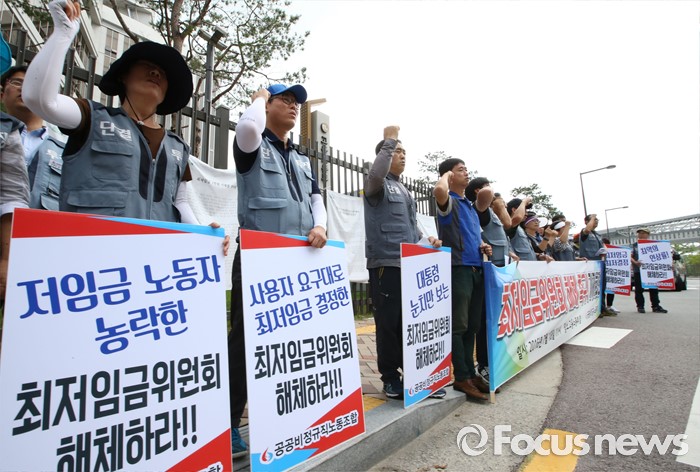 (세종=포커스뉴스) 공공비정규직노동조합 구성원들이 18일 오전 세종시 정부세종청사 고용노동부 앞에서 기자회견을 열고 2017년도 최저임금 6470원 결정 무효를 주장하며 최저임금위원회 해체를 촉구하고 있다.