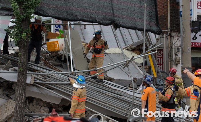 (서울=포커스뉴스) 18일 오후 서울 서대문구 홍은동 한 공사장에서 붕괴사고가 일어나 소방대원들이 구조작업을 벌이고 있다. 소방당국은 붕괴된 건물에 현재 1명이 매몰되어 있다고 밝혔다.