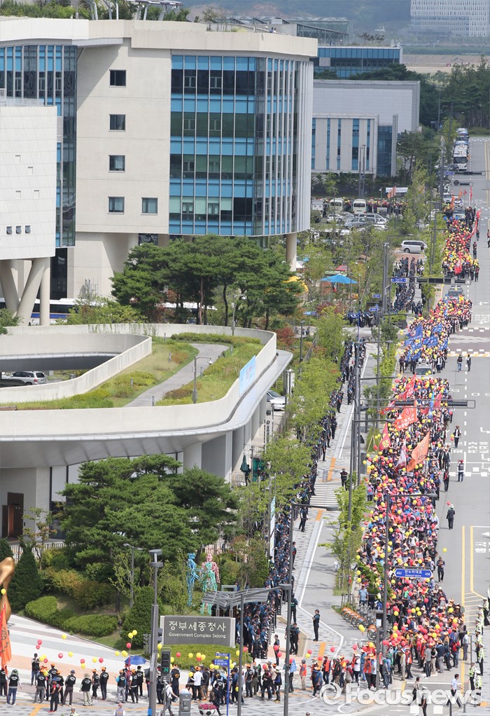 (세종=포커스뉴스) 전국건설기계연합회 구성원들이 18일 오후 세종시 정부세종청사 국토교통부 앞에서 굴삭기 수급조절을 통해 임대사업자를 보호할 것을 촉구하며 가두행진을 하고 있다.